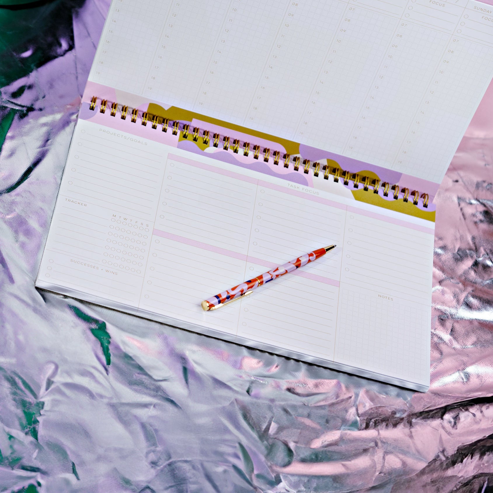 Features week scheduling spreads, task organiser, month overviews and notes pages.
